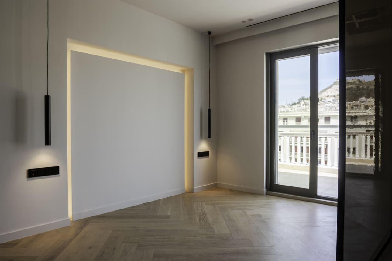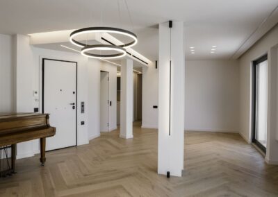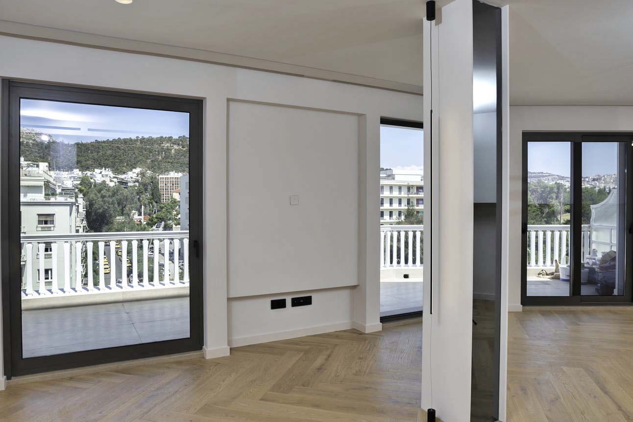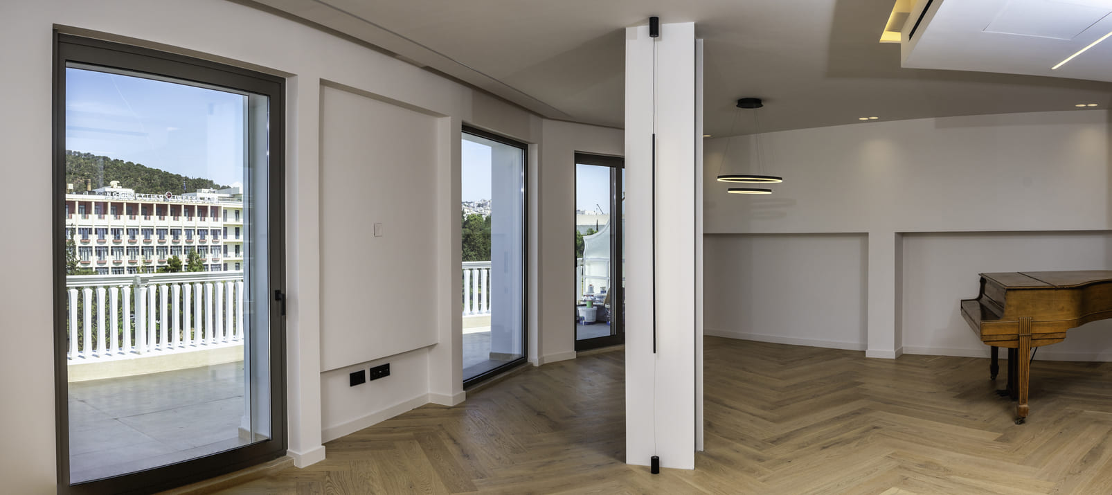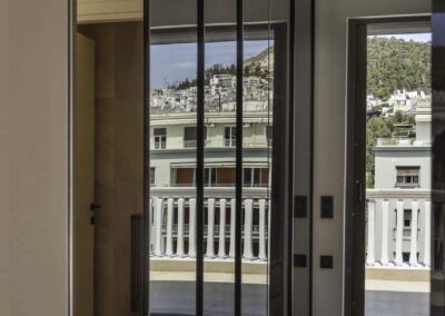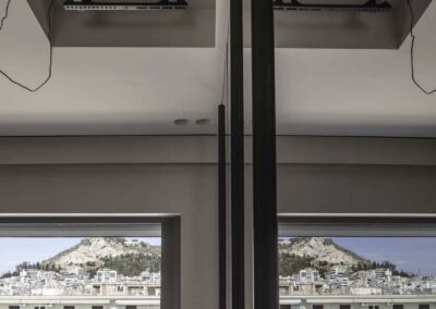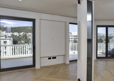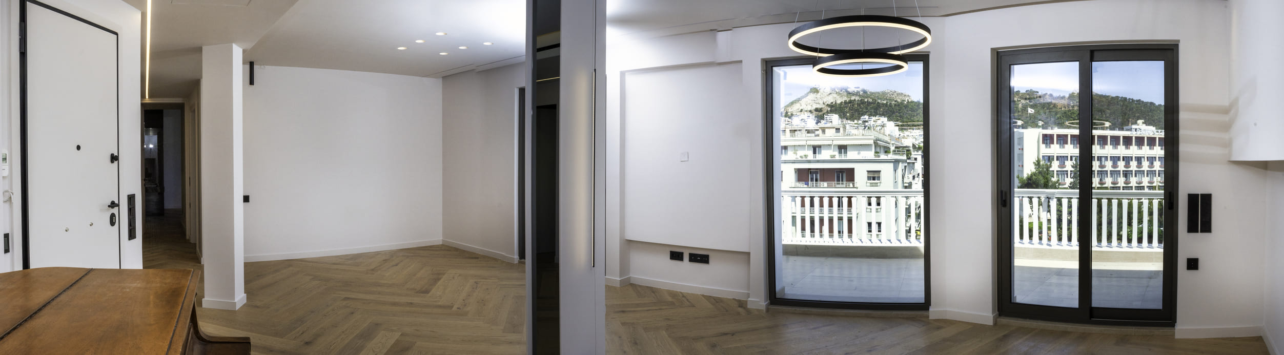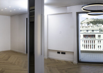 Ολική ανακαίνιση Δικηγορικού γραφείου σε πολυκατοικία στο κέντρο της Αθήνας. Για την τελική διαμόρφωση του χώρου ενώθηκαν αρχικά δυο διαμερίσματα. Μετά την ολοκλήρωση των οικοδομικών εργασιών τοποθετήθηκαν τα πατώματα, έγινε η προσθήκη των επίπλων, των θερμαντικών σωμάτων, των ειδών υγιεινής και των καινοτόμων συρόμενων συστημάτων. Η ανακαίνιση ολοκληρώθηκε με την διαρρύθμιση του φωτισμού.