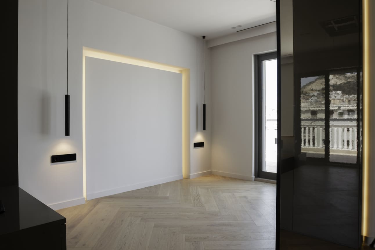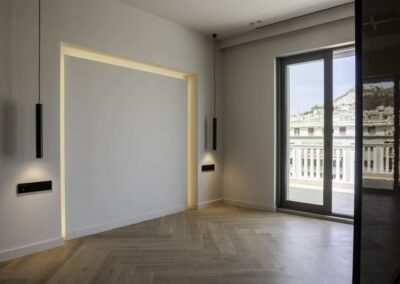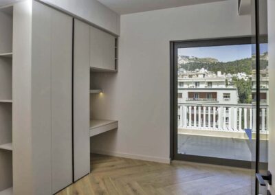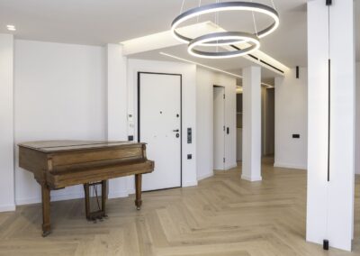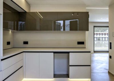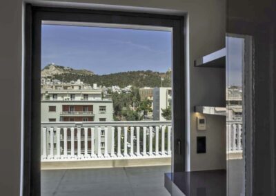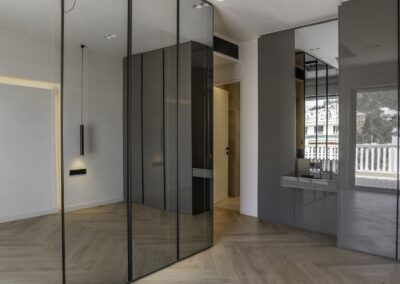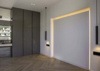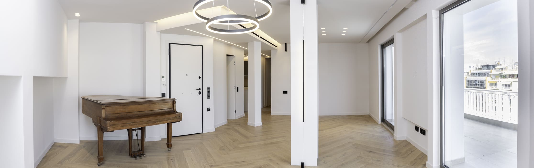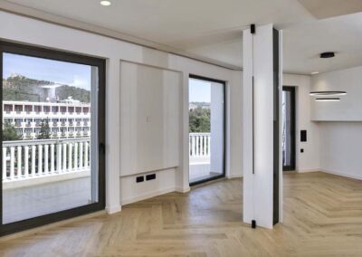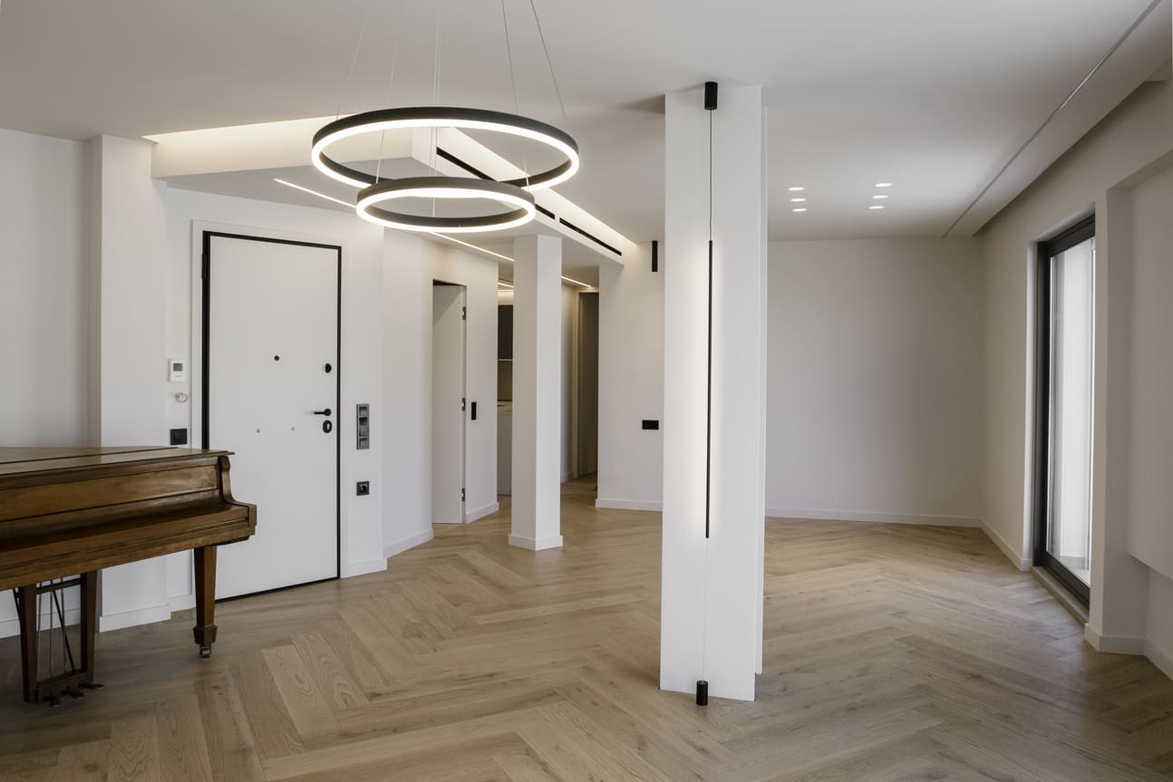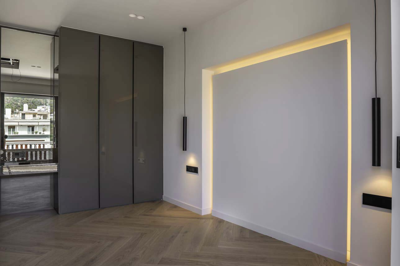 Ολική ανακαίνιση Δικηγορικού γραφείου σε πολυκατοικία στο κέντρο της Αθήνας. Για την τελική διαμόρφωση του χώρου ενώθηκαν αρχικά δυο διαμερίσματα. Μετά την ολοκλήρωση των οικοδομικών εργασιών τοποθετήθηκαν τα πατώματα, έγινε η προσθήκη των επίπλων, των θερμαντικών σωμάτων, των ειδών υγιεινής και των καινοτόμων συρόμενων συστημάτων. Η ανακαίνιση ολοκληρώθηκε με την διαρρύθμιση του φωτισμού.